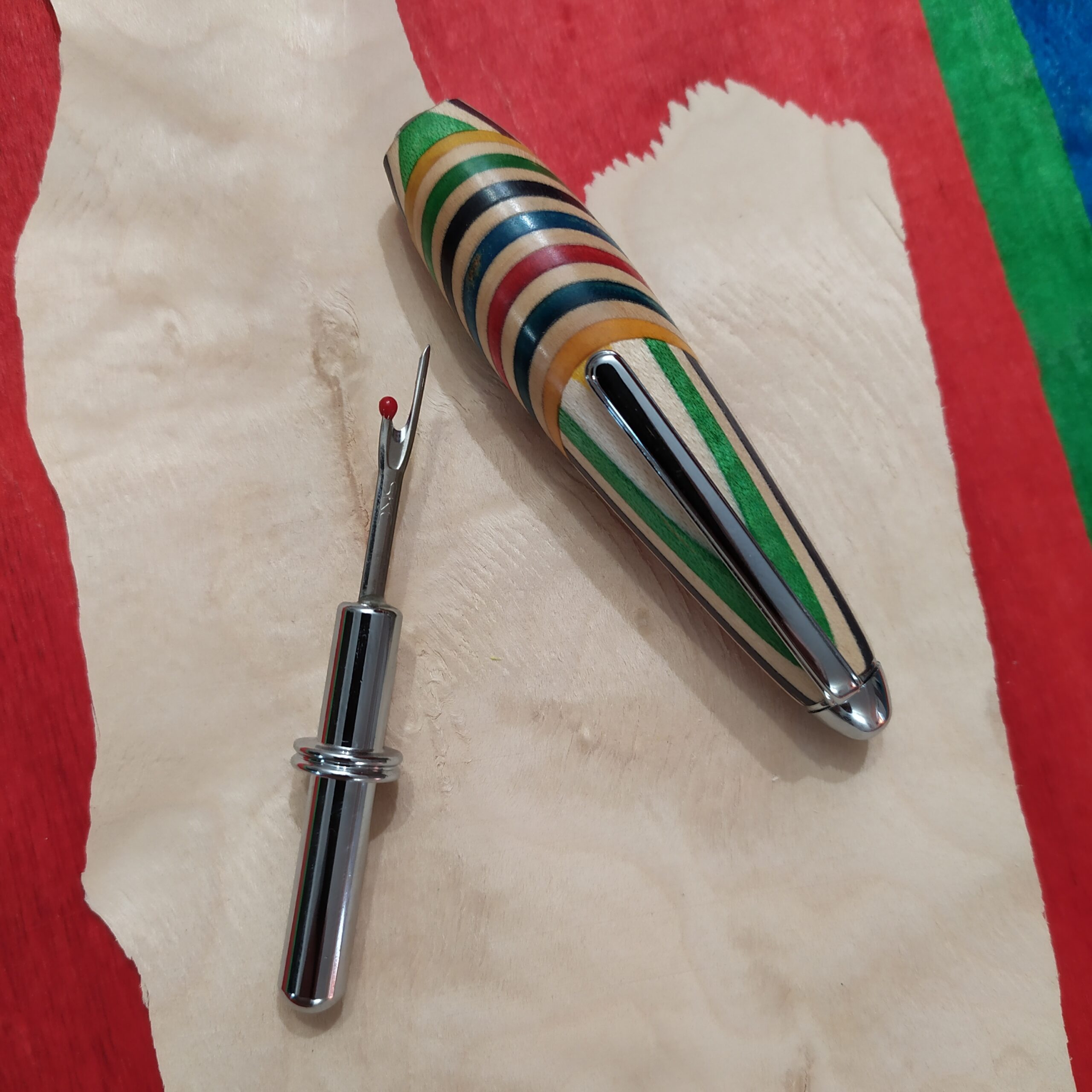 Je peux ainsi agencer à ma guise les couleurs ce qui m’offre une grande liberté graphique et surtout je peux réaliser des blocs à presque n’importe quelle taille. Ce qui est idéal pour la création de découseurs pour les couturières ou de stylos pour les amoureux de l’écriture.