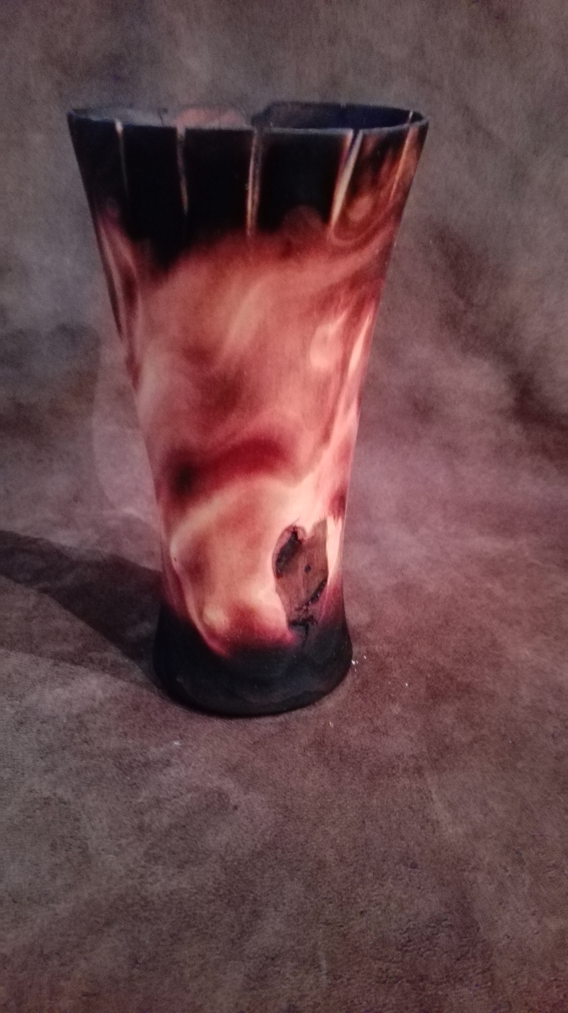 Avant application il est nécessaire de préparer la pièce avec plusieurs couches de Bouche-pores afin de rendre la surface non poreuse. La pièce est ensuite recouverte de plusieurs couches de peinture Ceramic rouge, faisant ressortir les craquelures issues du brûlage initial. Pour ce premier essai je trouve le résultat assez intéressant mais la couleur manque de profondeur (j’envisage de recouvrir le tout de plusieurs couches de vernis PU). le résultat en images :